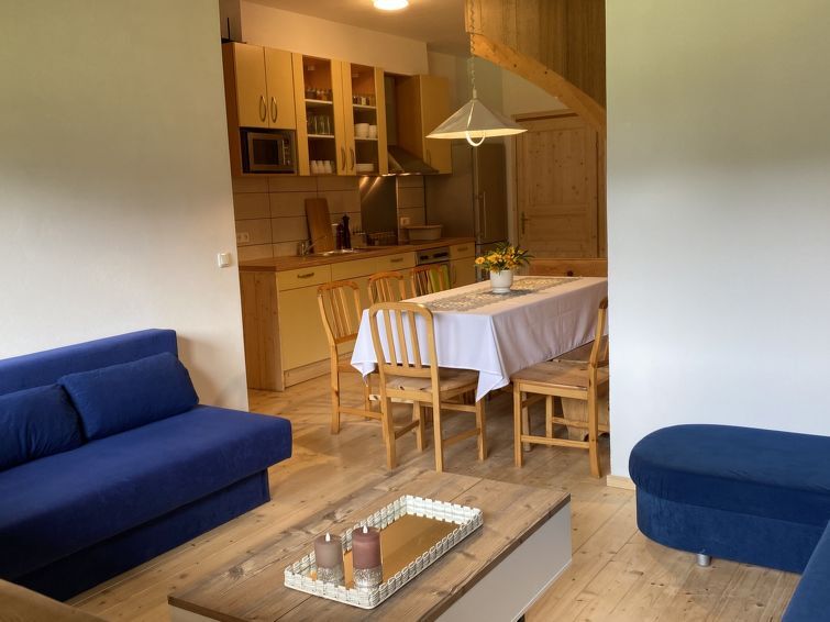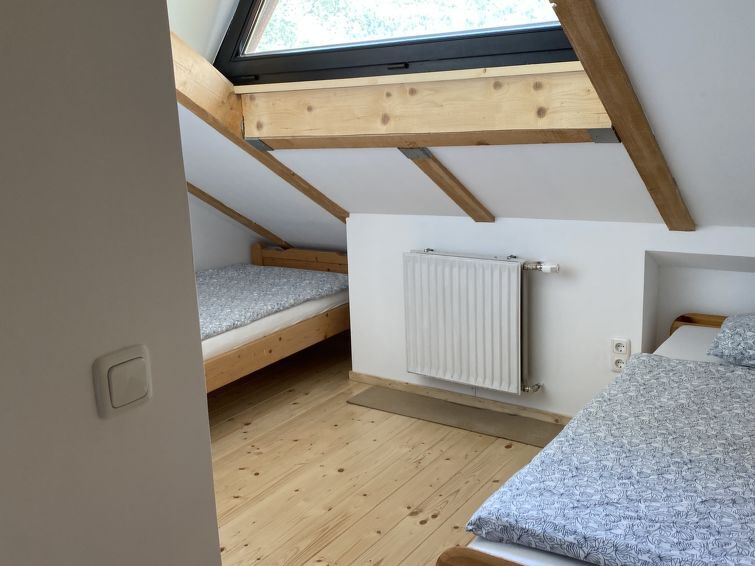 "Hasenstall / Top 8", appartement 5-kamers 79 m2 op 2 verdiepingen op de 2e verdieping. Het objekt is geschikt voor 8 volwassenen + 1 kinderen. Gedeeltelijk afgeschuinde daken, volledig gerenoveerd in 2023, zeer smaakvol en met veel hout ingericht: hal. Groot, open woon-/eetkamer. 1 2-pers. kamer met 1 2-pers divanbed. 1 2-pers. kamer met 1 x 2 stapelbedden. Open keuken (oven, afwasmachine, broodrooster, waterkoker, elektrische koffiemachine). 2 bad/douche/WC's. Bovenverdieping: 1 2-pers. kamer met 1 2-pers bed. 1 2-pers. kamer met 2 bedden. Parketvloeren. Klein balkon 6 m2. Zeer mooi panoramazicht op de bergen. Ter beschikking: wasmachine, strijkijzer. Internet (Internet (WiFi), gratis). Geschikt voor families. Privé ingang, rookmelders, brandblusser, geen lift.