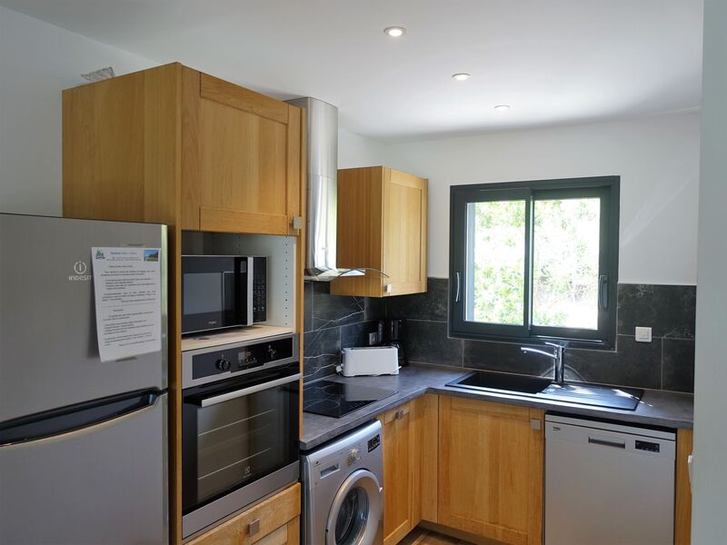 Rijtjeshuis "Les Jardins d'Ève", bouwjaar 2019, omgeven door bomen. 8 km van het centrum van Solenzara, 33 km van het centrum van Porto Vecchio, 105 km van het centrum van Bastia, zonnige ligging, 150 m van zee, directe toegang tot het strand. Voor alleengebruik: openluchtzwembad verwarmd (7 x 3 m, 150 cm diepte, seizoensgebonden beschikbaarheid: 02.Apr. - 01.Okt.) met alarminstallatie. Parkeerplaats op het terrein. Winkel 1.5 km, supermarkt 8 km, bushalte 9 km, zandstrand "Baie de Canella" 900 m, rotsstrand 300 m. Wandelgebied Aiguilles de Bavella 39 km. Auto noodzakelijk.