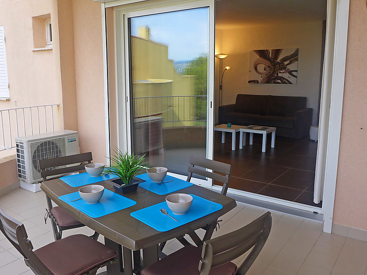 Appartement 2-kamers 40 m2 op de 3e verdieping. Volledig gerenoveerd in 2016, doelmatig en comfortabel ingericht: woon-/eetkamer met 1 2-pers divanbed, TV, Flatscreen TV en air-conditioning. Uitgang naar het terras. 1 kamer met 1 2-pers bed (140 cm, lengte 190 cm). Open keuken (oven, afwasmachine, 3 keramische glas kookplaten, broodrooster, waterkoker, magnetron, elektrische koffiemachine). Bad/WC. Elektrische verwarming, air-conditioning. Terras 14 m2, overdekt. Terrasmeubelen, barbecue. Beperkt uitzicht op zee. Ter beschikking: wasmachine, strijkijzer. Internet (Internet (WiFi), extra). Geen parkeerplaats. Rookmelders.